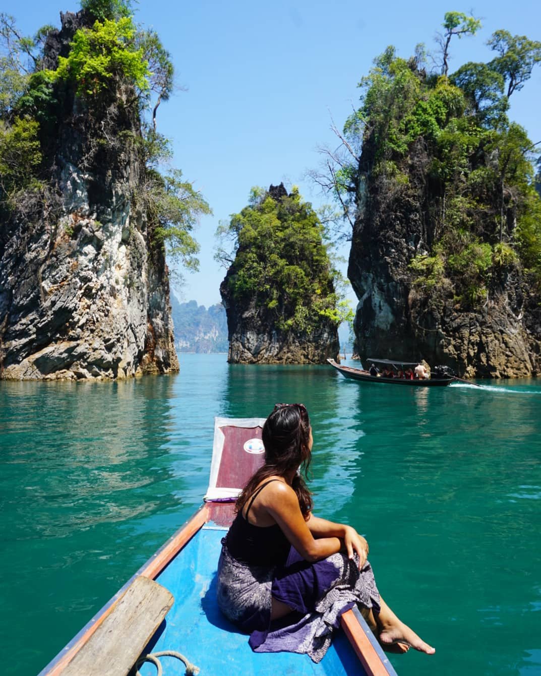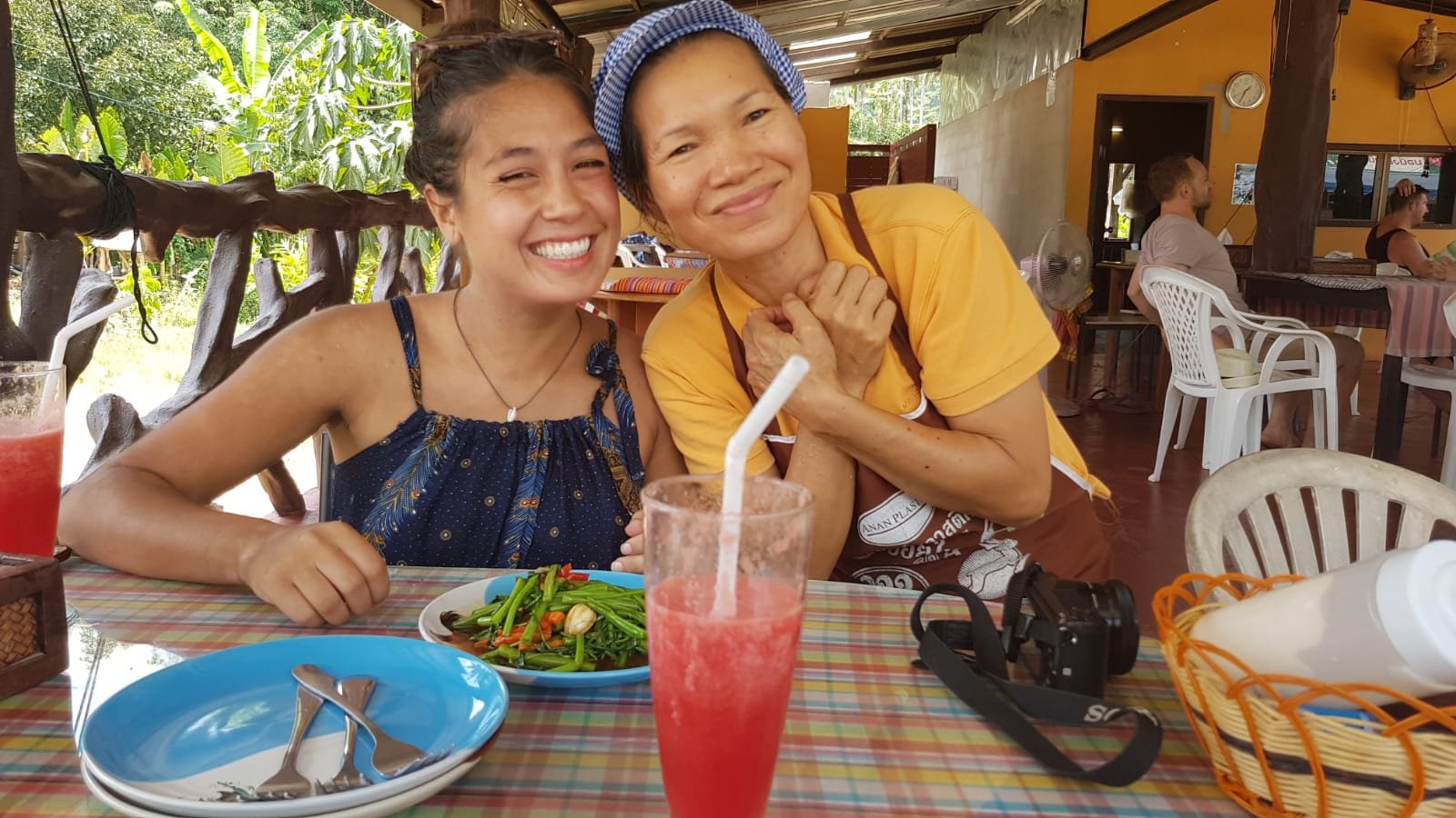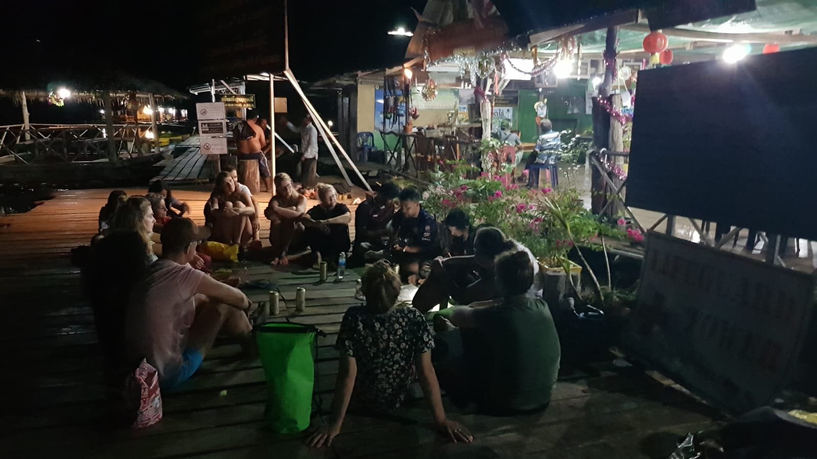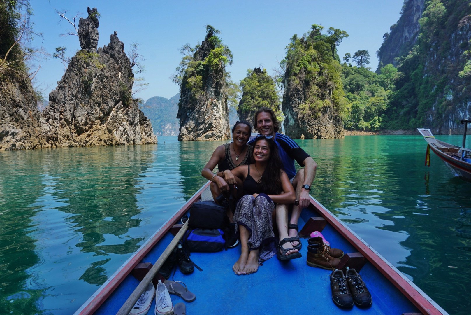 Onze grote bagage lieten we ’s ochtends achter bij de guesthouse en met een daypack gingen we mee op de tweedaagse tour. De bootrit op het meer naar onze bungalows was prachtig! Het water was blauwgroen en overal waren groepjes eilanden en steile rotsen. We zouden gaan overnachten in bungalows die drijven op bamboevlotten. Zo’n mooie plek om te slapen! Na het droppen van onze bagage en een duik in het meer kunnen we aanschuiven voor de lunch. Een volle tafel met allemaal ontzettend lekkere gerechten! De groep was ook leuk. Een vrouwengroep met veel Nederlanders. Mijn vader was de enige man 🙂 Heb het vooral heel leuk gehad met de Nederlandse Nora en Montana! Na de lunch vertrokken we voor een trip naar een grot. Na een tocht door dichtbegroeide jungle en door water moesten we al onze spullen achterlaten. Het voelde nogal onprettig, maar onze gids Lek liet weten dat we in de grot “100 procent wet” worden, dus liet ik al mijn waardevolle spullen achter bij een boom. In de grot was het flink klimmen op stenen en ook zwemmen op sommige stukjes. De mijnwerkerslampen die iedereen droeg verlichtten de grot gelukkig. Lek liet de vleermuizen zien die boven ons hingen en allemaal enge, supergrote spinnen. Het was de meest spannende grot tot nu toe, maar ik was ook blij toen we er eindelijk weer uit waren. De waardevolle spullen lagen er gelukkig allemaal nog. De dag werd afgesloten met een nightsafari op een bootje. We hebben apen gespot en toekans. Na het eten speelden de gidsen nog gitaar en zongen ze een beetje. Leuk om te zien 🙂