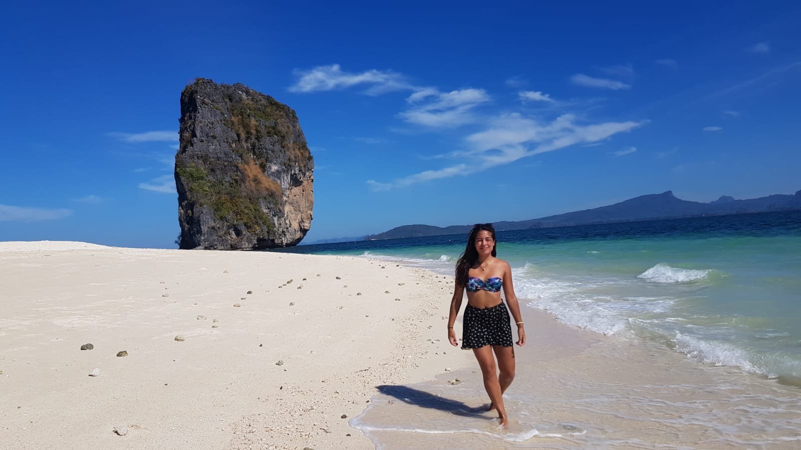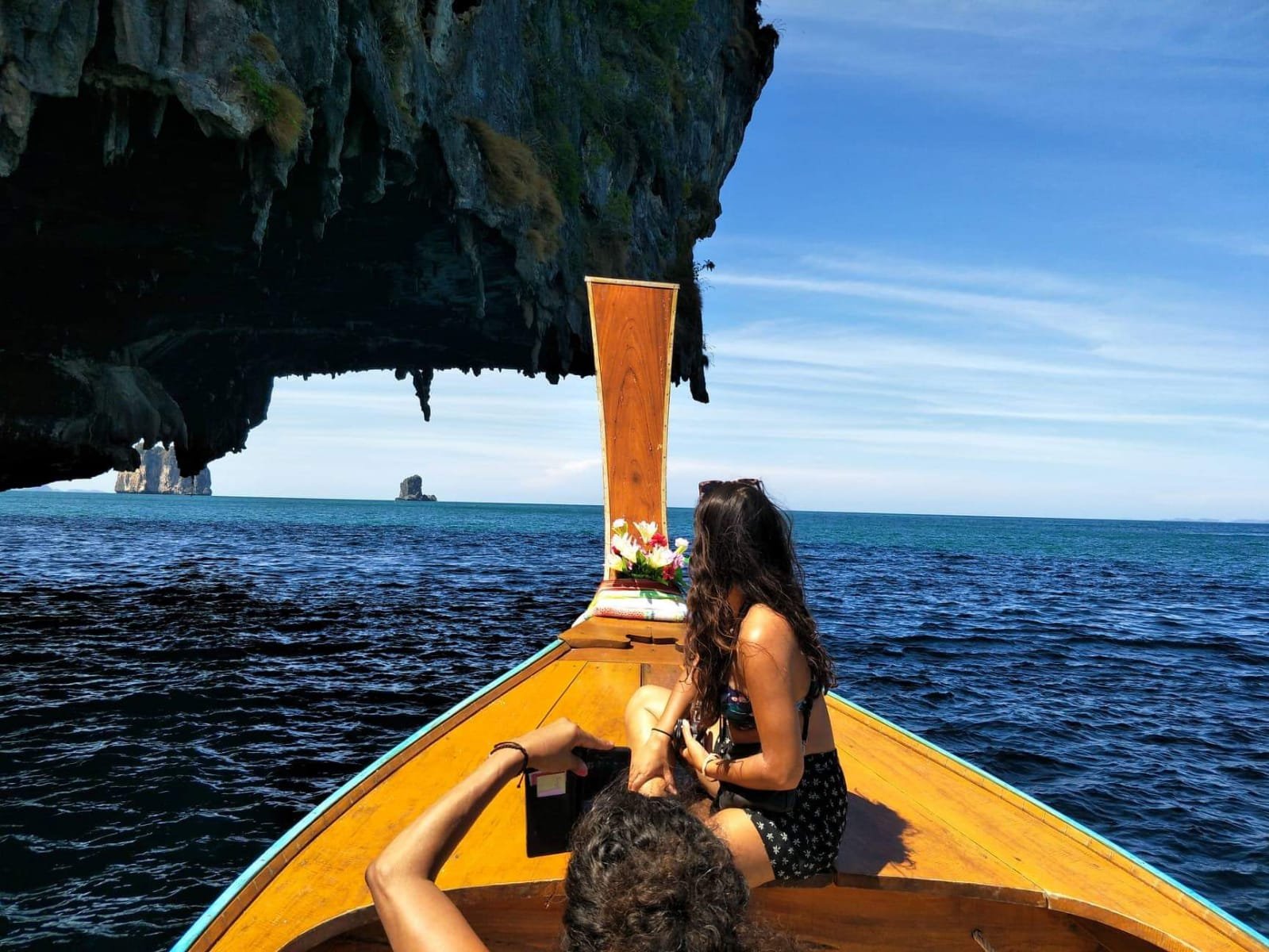 We hebben een priveboot gehuurd om te gaan eilandhoppen vandaag! Voor een hele dag kost dat zo’n 55 euro. Gedeeld door drie is dat nog steeds veel meer dan ik normaal gesproken op een dag zou uitgeven, dus ik ga er goed van genieten 🙂 We zijn vroeg vertrokken en hebben het geluk dat we de eersten zijn op het eerste strand. De twee Thaise jongens die met ons meegaan op de boot zijn supervriendelijk en behulpzaam. Ze blijken het ook heel leuk te vinden om foto’s van ons te maken want ze kunnen er niet mee op houden. Ik dacht dat wij erg waren, maar ben geloof ik nog nooit zo vaak op de foto gezet als vandaag. Alle kleuren zijn zo mooi fel. Knalblauwe lucht, helder water, groene begroeiing op de rotsen. Eind van de dag heb ik afscheid genomen van mijn ouders. Morgen ga ik naar Koh Lanta!
