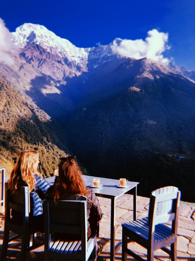 In de guesthouse had ik twee Australische meisjes ontmoet, Emmely en Brody, die ook naar Annapurna Base Camp wilden. Mijn wandelclubje van de afgelopen dagen had hier geen tijd voor, dus het was fijn dat ik met hen mee kon lopen. Ze hadden ook nog eens gidsen, dus dat was helemaal handig. In het begin wilde ik me niet teveel aan hen opdringen. Helemaal omdat ze behoorlijk wat voor die gidsen bleken te betalen en ik wilde niet overkomen alsof ik zomaar eventjes daarvan zou meeliften. Maar we hadden het gelukkig heel gezellig en ze betrokken me bij alles dus uiteindelijk heb ik de hele trek met hen afgelopen. Na tien dagen stonden we weer beneden aan de berg. Wat een tocht! Ik heb nog nooit zoveel fysieke inspanning dagen achtereen gedaan. We liepen zo’n zes tot acht uur per dag, omhoog en omlaag, en dan ook nog eens een zware backpack op mijn rug. Maar allemaal driehonderd procent de moeite waard.