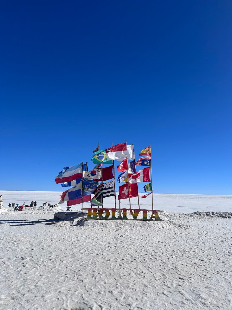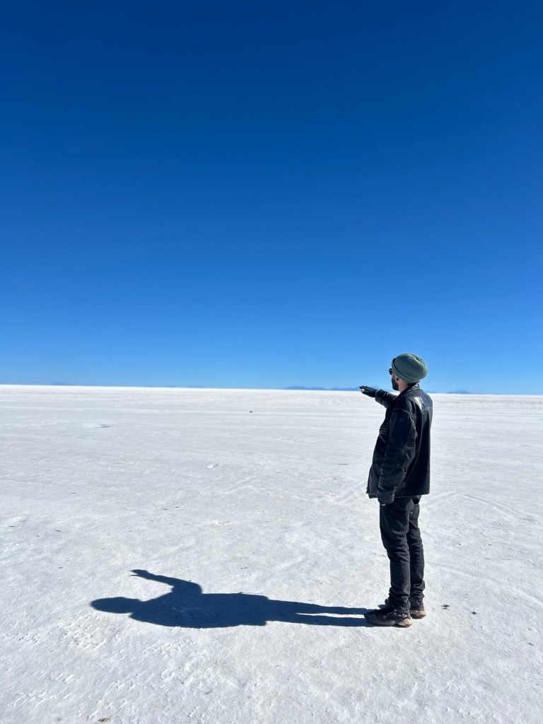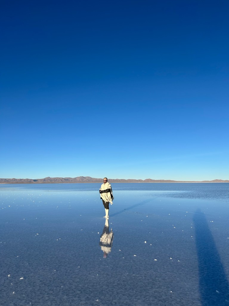 Het is maar goed dat we een 4 wheel drive hebben, want het is een behoorlijk waterige en hobbelige rit richting de zoutvlakte. Een goede zonnebril is ook hoognodig, want zodra we uitstappen is het weerkaatsende licht tegen de witte zoutvlakte oogverblindend. Een gekke gewaarwording om in een uitgestrekt wit landschap te lopen met een knalblauwe lucht. De zoutvlakte schijnt meer dan tienduizend vierkante kilometer groot te zijn!