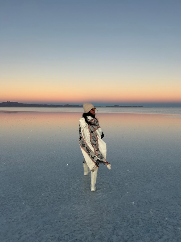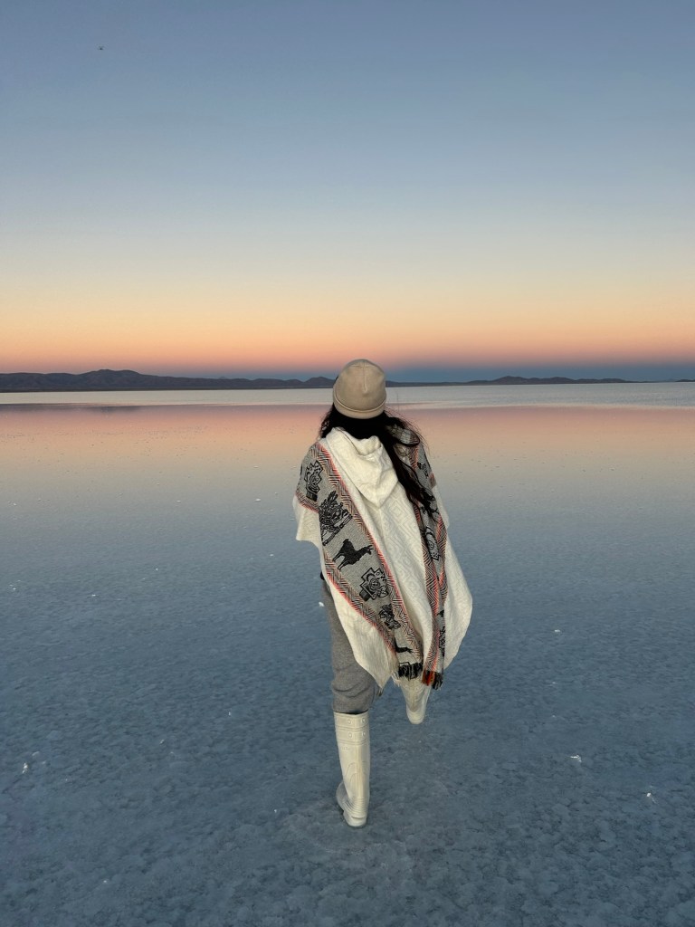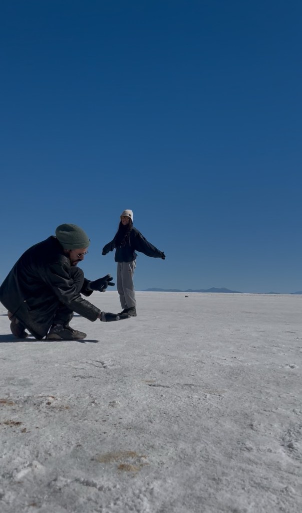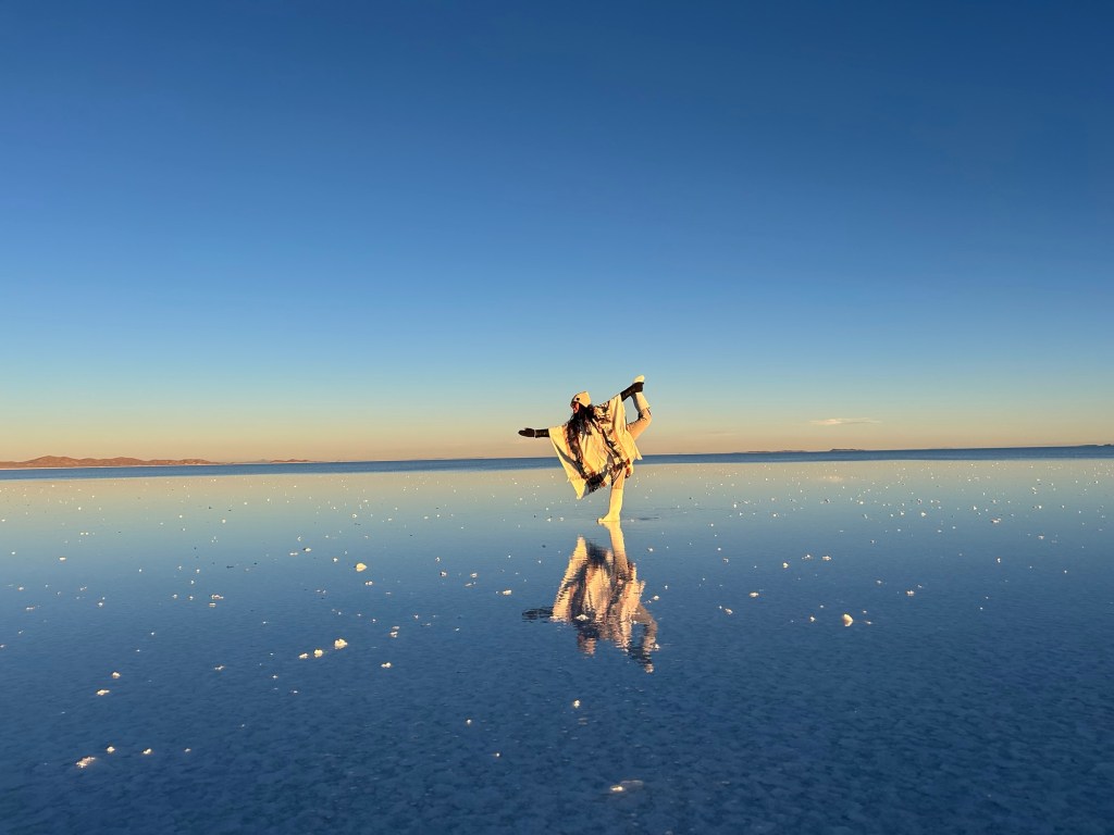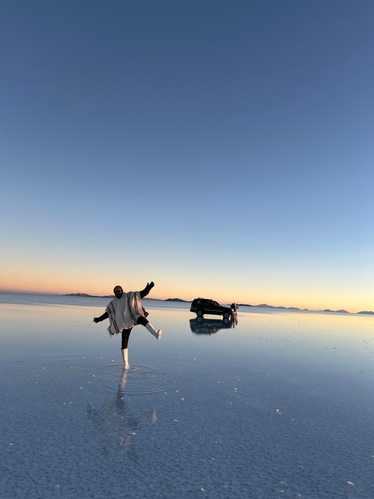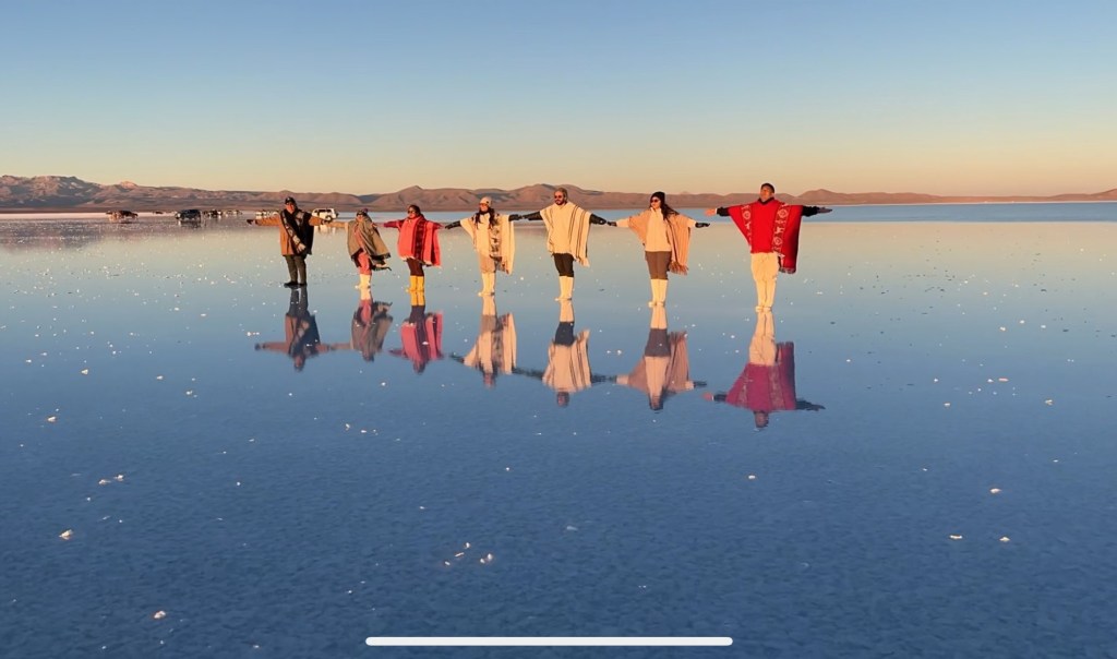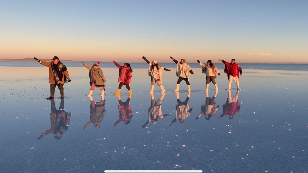 We sluiten de tour af met een prachtige zonsondergang, midden op de zoutvlakte. Met de ondergaande zon transformeert het water op het zout tot een heldere spiegel. Bijzonder om te zien op zo’n groot oppervlak! De gids is zo vriendelijk om een filmpje te maken van de groep. Met zijn jeep rijdt hij vier rondjes om ons heen terwijl hij ons instrueert welke poses we moeten aannemen. We doen er wat lacherig over, maar uit het resultaat blijkt dat zijn ervaring met fotograferen en filmen op Salar de Uyuni zijn vruchten afwerpt!
