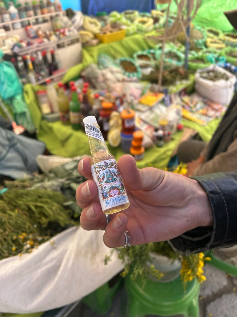Op onze laatste dag voor vertrek is er een extra grote markt door de stad. We kopen timolina, een alcohol-achtige vloeistof in een piepklein flesje. Volgens de Peruanen van onze tour is het een wondermiddel tegen hoofdpijn, en inderdaad! Na twee druppels op de slapen te hebben gedept verdwijnt de hoofdpijn als sneeuw voor de zon!