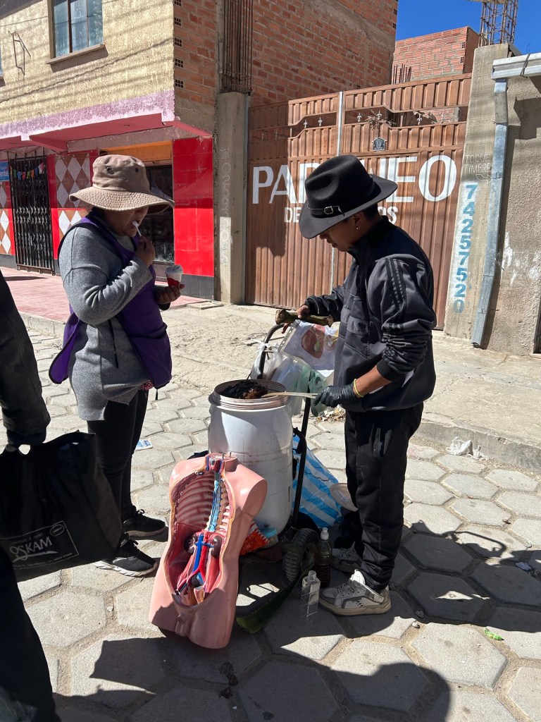 We blijven nog twee dagen in het dorpje Uyuni voor we onze reis vervolgen naar La Paz, ook wel bekend als de hoogste hoofdstad ter wereld. In Uyuni zelf is niet veel te beleven, maar toch kijken we onze ogen uit. Zo hebben veel Boliviaanse vrouwen twee vlechten, een hoge hoed en traditionele kleding. Op iedere hoek worden mysterieuze natuurgeneesmiddelen aangeboden, zoals slakkenslijm, bloed van bomen en kruidendrankjes. Het meest aparte om te zien zijn toch wel de vele dode baby lama’s waarmee vooraan de etalages van veel winkels wordt gepronkt. Veel Bolivianen geloven dat het geluk en bescherming brengt om een exemplaar in je huis op te hangen. Ik vind het vooral heel zielig om te zien. Als je meer inzicht wilt in je toekomst, kun je op vrijwel elke straathoek terecht bij iemand die coca-bladeren leest of rituelen en spreuken uitvoert om jouw gewenste uitkomst te beïnvloeden.